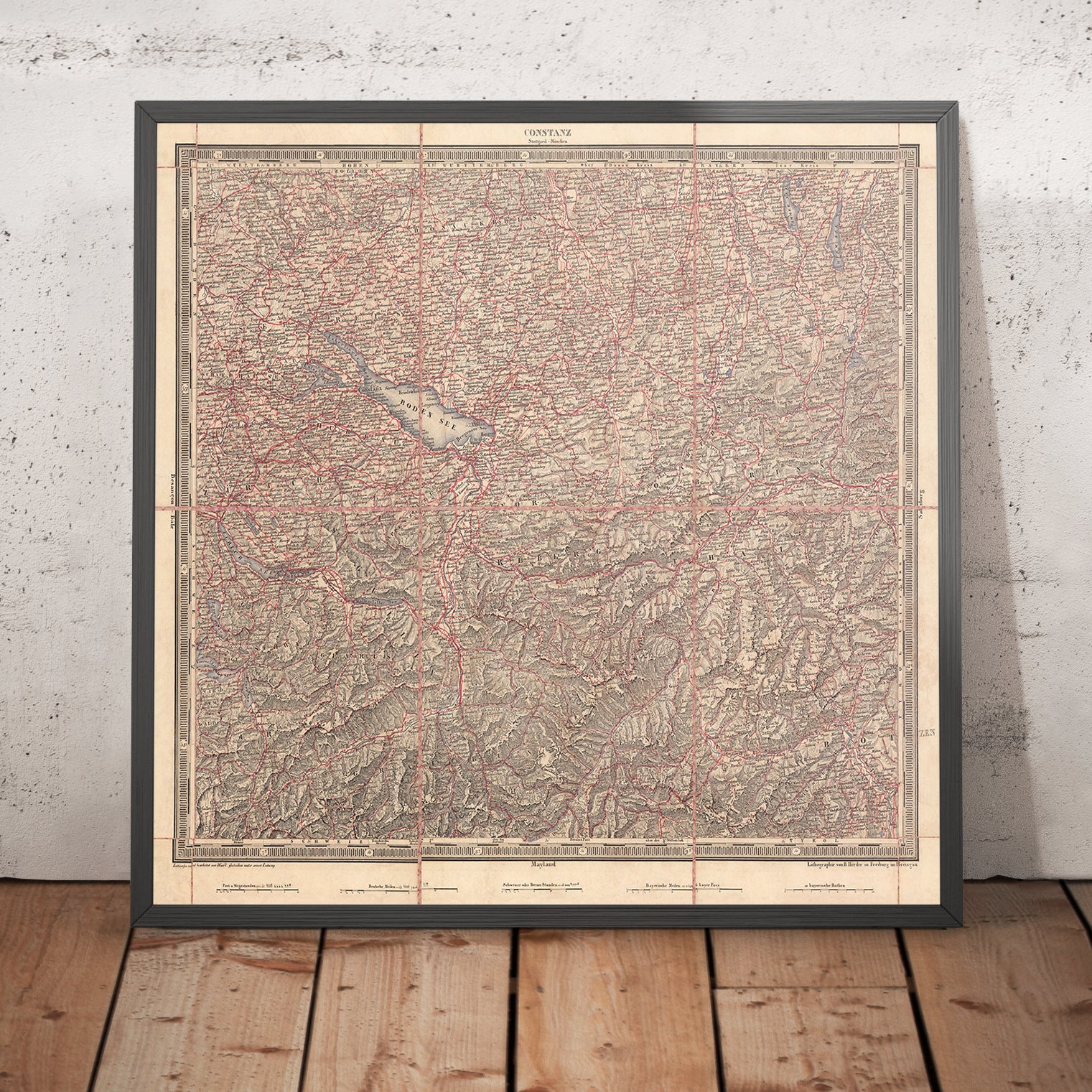 Constanz—Joseph Edmund Woerl’s 1850 portrayal of the Lake Constance region—stands as a refined achievement within his Atlas of Central Europe. Centered on the storied shores of Bodensee, the sheet unites German and Swiss cultural spheres, situating Konstanz and Freiburg to the north and west with Zurich, St. Gallen, and Lucerne arrayed along the alpine forelands. At a carefully judged 1:500,000, the composition balances regional sweep with intimate detail, guiding the eye along major rivers and across a terrain articulated by elegant hachures. Bathymetric lines and soundings lend the lake a quiet, sculptural depth, while the map’s clean lettering and restrained palette create an atmosphere of poised clarity. The result is a learned, lucid guide to a crossroads of trade, language, and landscape.