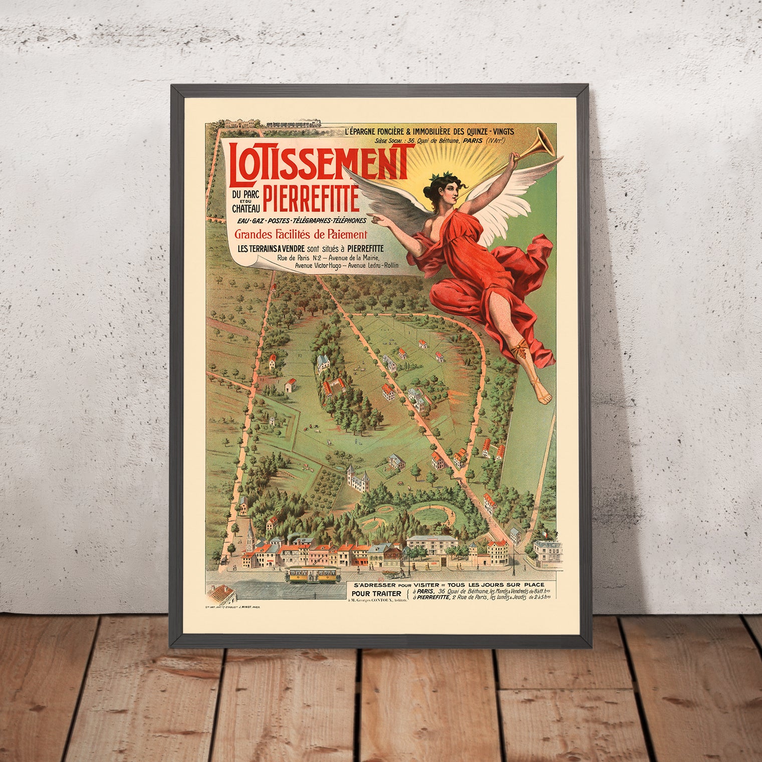 Lotissement du Parc et du Chateau Pierrefitte by Établissements Minot (1903) captures the optimism of the Belle Époque in a luminous vision of suburban Paris. Designed as an advertisement for a new residential development at Pierrefitte—just beyond the city’s historic limits—the poster blends allegory and modernity: a winged figure presides over a geometric patchwork of plots, streets, and gardens, suggesting prosperity, order, and growth. Bright greens, sun‑lit yellows, and confident reds carry the eye from the angel’s flowing drapery across neatly arrayed houses and tree‑lined avenues, a visual promise of fresh air, well‑planned streets, and a refined life within easy reach of the capital.