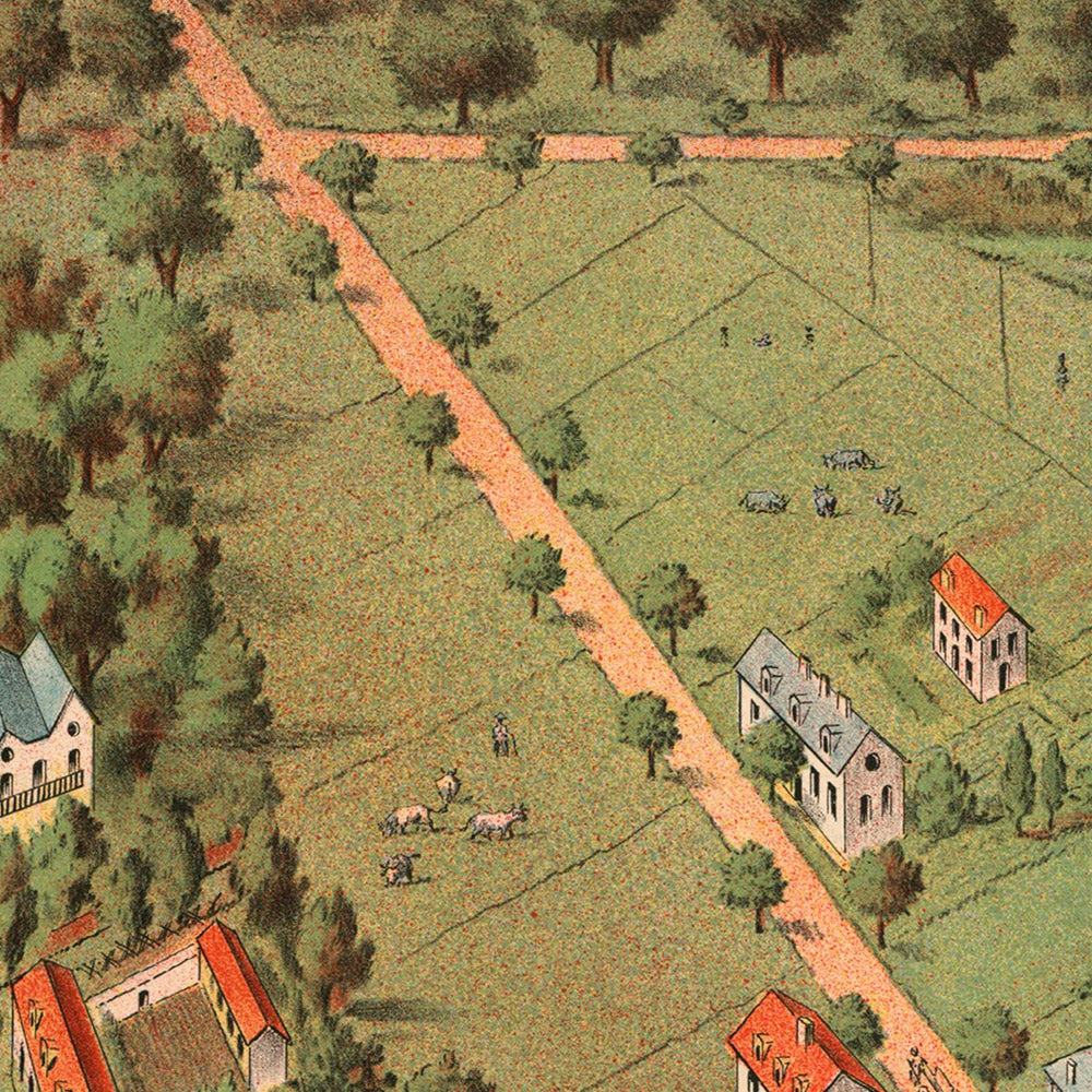 Artistic highlights: The lithographic technique yields saturated greens for parks and fields, while warm yellows and reds lift roofs, garments, and headline lettering off the page. Strong, angular lines trace roads and plot boundaries, contrasting with the soft, organic silhouettes of trees and the angel’s billowing robe. This play of geometry and grace is a hallmark of the period’s best poster art, where allegorical figures symbolized progress and civic pride. The result is a striking statement piece—a fluent mix of typography, map‑like planning, and fine illustration—equally at home in contemporary, eclectic, or vintage interiors.