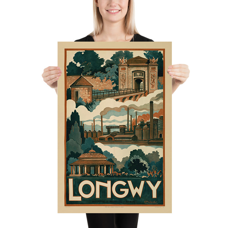 Why Longwy matters: Straddling routes between France, Luxembourg, and Belgium, Longwy became synonymous with ceramics (faïence) and heavy industry—especially metallurgy—during an era when French manufacturing was both an engine of recovery and a symbol of national resilience. The poster’s emphasis on smokestacks and structured skylines speaks to that legacy while acknowledging the town’s green fringes and rolling terrain. It reads as a love letter to a working landscape: industrious, enduring, and unmistakably Lorraine.