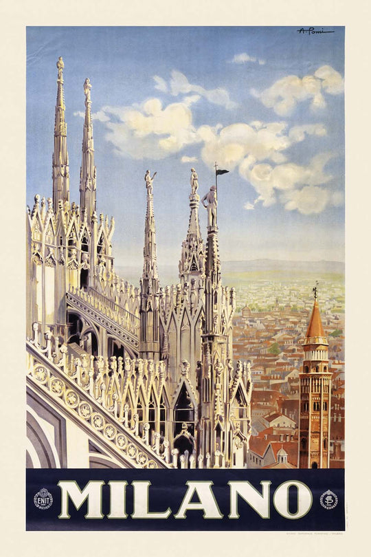 Milano by Allessandro Pomi (1920) is a luminous Art Deco travel poster that celebrates the grandeur of northern Italy’s cultural capital. Centering the soaring spires of the Milan Cathedral (Duomo di Milano), Pomi blends reverence for Gothic architecture with the streamlined optimism of early twentieth‑century design. Created at a moment when European cities were reintroducing themselves to the world through tourism and modern transport, this poster captures Milan’s dual identity: historic stonework reaching skyward under a serene, contemporary sky.