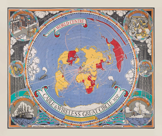 Old Cable & Wireless Great Circle Map, 1945 by Max Gill: Flat Earth British Empire Submarine Network Chart