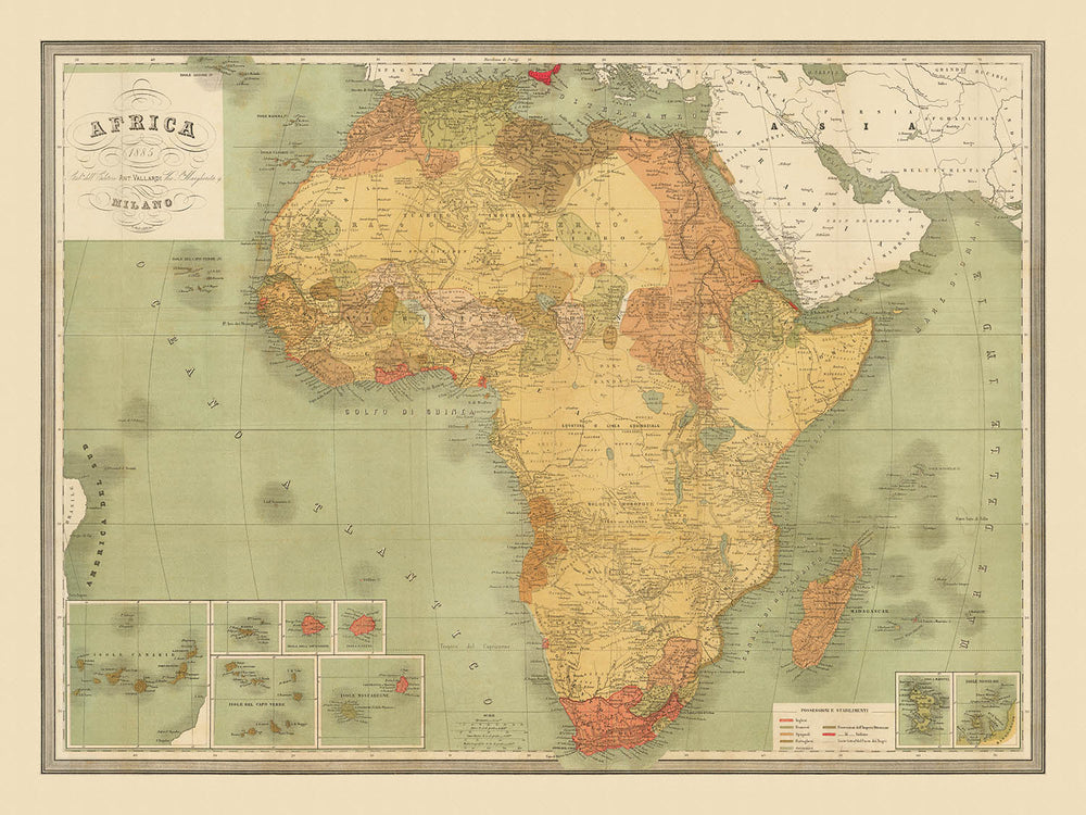 Step into the rich tapestry of history with the "Africa 1885" map, a masterpiece crafted by the renowned Ant. Vallardi in Milan. This exquisite map offers a glimpse into the geopolitical landscape of Africa during the late 19th century, a time when European powers were fervently expanding their empires. Vallardi, celebrated for his detailed and educational cartographic works, presents a vivid portrayal of the continent, capturing the essence of the era known as the Scramble for Africa. This map is not just a depiction of land; it is a historical document that tells the story of ambition and exploration.