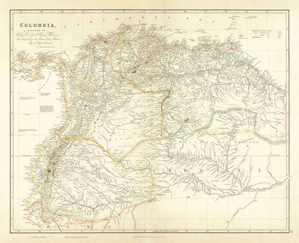A gorgeous map of Colombia and Gran Colombia, originally published in 1834 by probably the most sought after mapmaker of the mid-19th century, John Arrowsmith.
