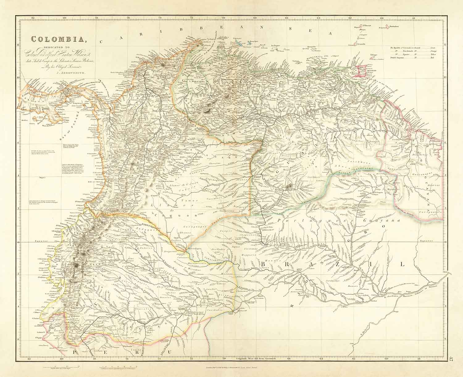 Old Map of Colombia, 1834 by Arrowsmith: Gran Colombia, Venezuela, Ecuador, Peru, Caribbean, Panama