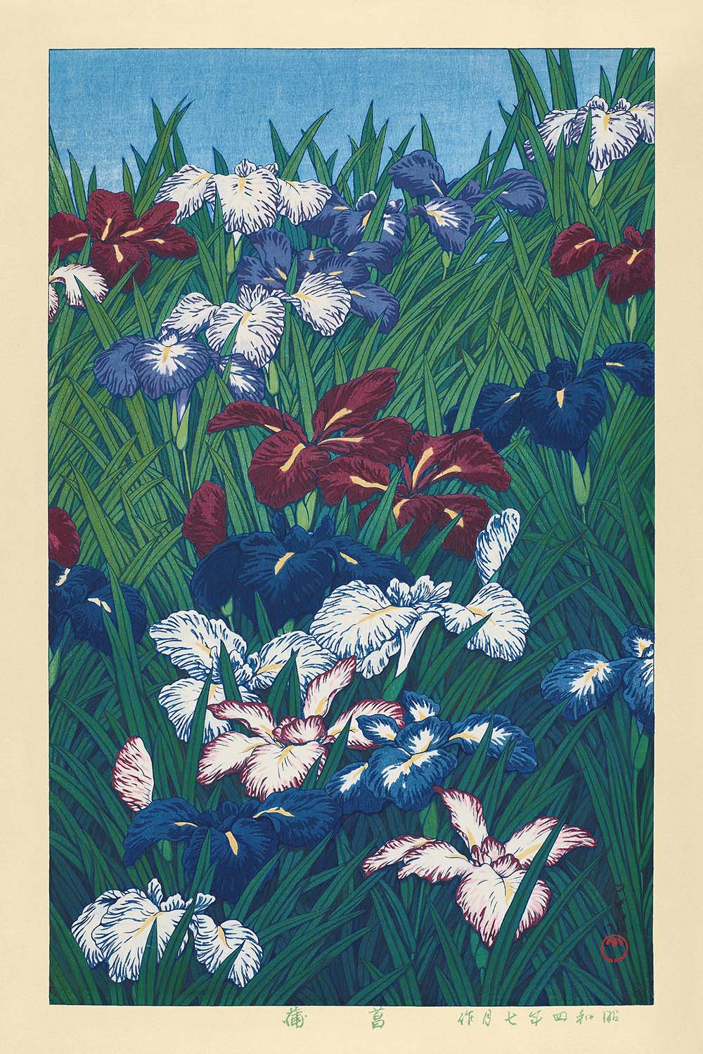 Schwertlilien hebt sich unter Kawases umfangreichem Werk durch ihre ätherische Darstellung blühender Schwertlilien hervor, die in einer ruhigen Landschaft schwanken. Die bemerkenswerte Komposition und die lebendigen Farben zeigen Kawases spezielle Fähigkeit, das Wesen natürlicher Ruhe einzufangen. Die dominierenden Blau-, Grün- und selektiven Rottöne schaffen kunstvoll eine beruhigende, aber auffällige Bildsprache, die jedes Interieur mit einem beruhigenden Farbtupfer und Eleganz bereichert.