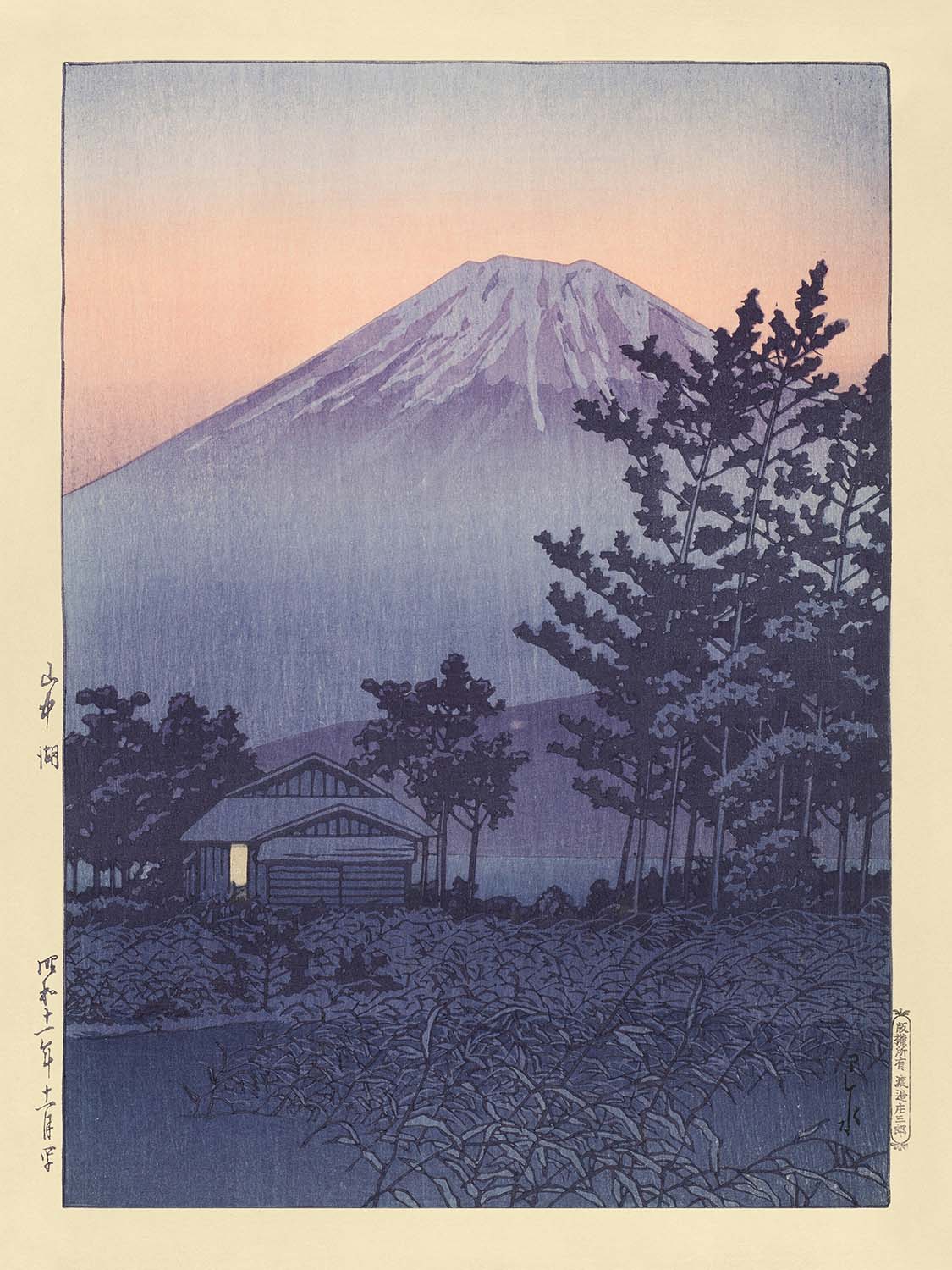 Der Sonnenuntergang am Yamanaka-See mit dem Fuji ist ein atemberaubender Holzschnitt von Hasui Kawase, einem verehrten japanischen Shin-Hanga-Künstler, der für seine eindrucksvollen Landschaften bekannt ist. Er wurde 1935 geschaffen und trägt den japanischen Titel „Yamanaka-ko no yūake“ (山中湖の夕焼け), dieses Kunstwerk fängt meisterhaft die majestätische Silhouette des Fuji ein, die über der ruhigen Oberfläche des Yamanaka-Sees im sanften Licht des Sonnenuntergangs emporragt. Mit seinem einzigartigen Talent, poetische Atmosphäre mit akribischer Technik zu verbinden, versetzt Hasui die Betrachter in einen ruhigen Moment, der in der Zeit schwebt – einen, der tief intim und universell beeindruckend wirkt.