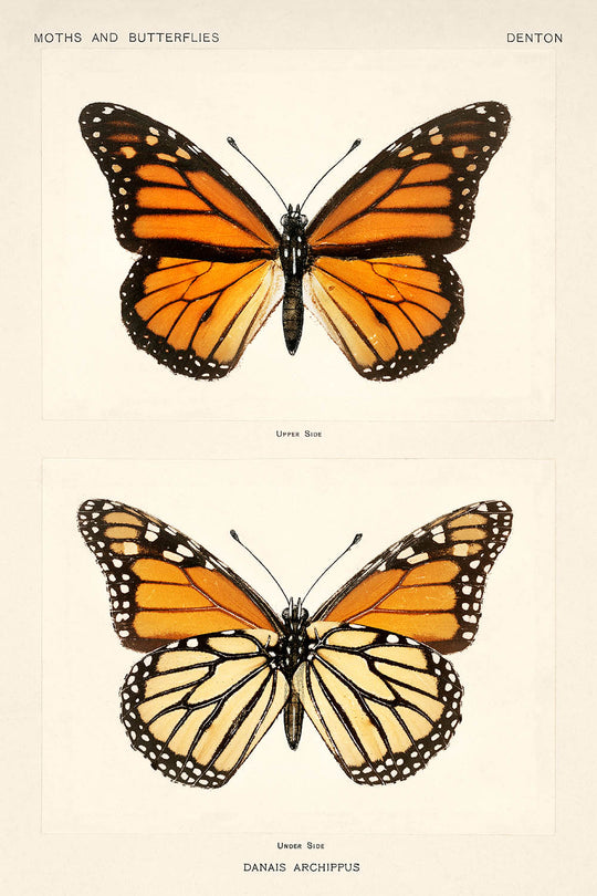Wir präsentieren den atemberaubenden "Monarchfalter" (Danais Archippus) von Sherman Denton, der erstmals 1900 veröffentlicht wurde. Diese viktorianische zoologische Illustration fängt die zarte Schönheit und die filigranen Details des Monarchfalters auf eine Weise ein, die sowohl wissenschaftlich genau als auch künstlerisch atemberaubend ist.