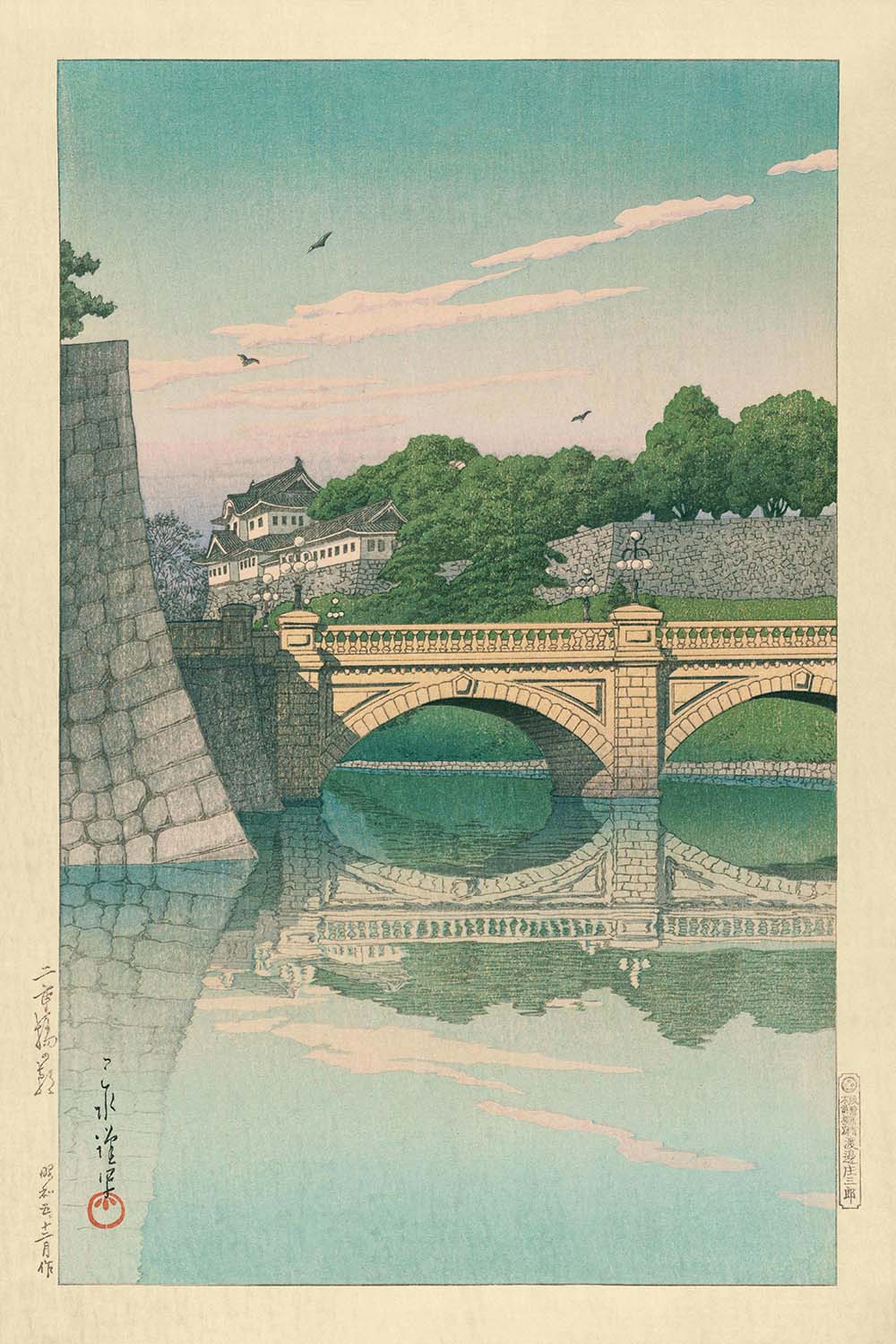 "Morgen an der Nijubashi-Brücke" von Hasui Kawase, ursprünglich 1935 geschaffen, fängt die ruhige Atmosphäre eines friedlichen Morgens an einem der ikonischen Landschaften Japans ein. Dieses Meisterwerk von Kawase, einer gefeierten Figur der Shin-Hanga-Bewegung, kombiniert traditionelle japanische Holzschnitttechniken mit westlichen Einflüssen und schafft eine visuelle Erzählung, die sowohl zeitlos als auch zeitgenössisch ist.