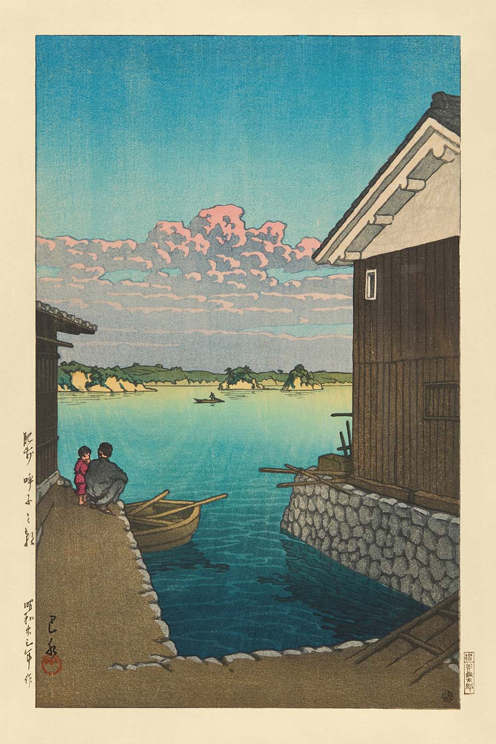 "Morgen in Yobuko, Hizen" von Hasui Kawase fängt die ruhige Schönheit eines stillen japanischen Dorfes im Morgengrauen ein. Hasui Kawase, gefeiert für seine außergewöhnlichen Beiträge zur Shin-Hanga-Bewegung in Japan, wird für seine Fähigkeit verehrt, die Ruhe und Zeitlosigkeit der japanischen Landschaft durch seine meisterhafte Verwendung des Holzschnitts einzufangen.