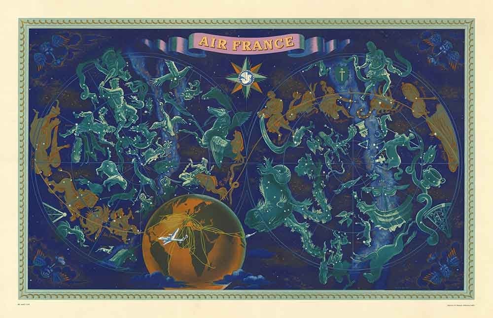 Alte Air France Himmels- & Tierkreis-Weltkarte, 1959 von Bucher: Historische Flugroutenkarte, Konstellationen