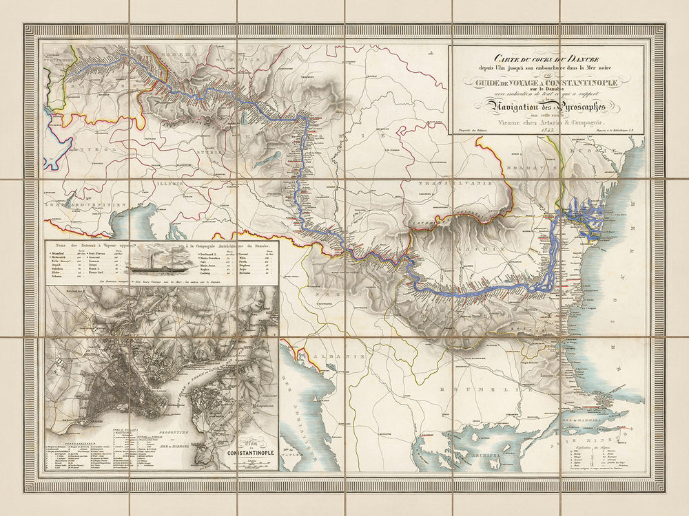 Die Karte enthält auch eine Skizze eines Dampfschiffs und eine Tabelle in der Mitte, die die 25 Dampfschiffe identifiziert, die von der Compagnie Autrichienne du Danube (Österreichische Donaugesellschaft) betrieben werden. Jedes Dampfschiff ist mit seiner Größe aufgeführt, was wertvolle Informationen über die Transportmöglichkeiten des Flusses zu dieser Zeit bietet. Darüber hinaus ist eine detaillierte Inset-Karte von Konstantinopel, dem heutigen Istanbul, in der unteren linken Ecke enthalten, die einen genaueren Blick auf diese bedeutende Stadt bietet.