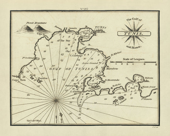 Begeben Sie sich auf eine historische Reise mit „Der Golf von Tunis und Biserte“, einer bemerkenswerten Seekarte, die 1802 vom angesehenen Kartografen William Heather angefertigt wurde. Diese Karte ist nicht nur ein Navigationsinstrument, sondern ein Fenster in die maritime Landschaft des Mittelmeers im frühen 19. Jahrhundert. Sie skizziert den Golf von Tunis akribisch und erfasst die komplexe Küstenlinie und die strategischen maritimen Standorte von Tunis, Biserte und Port Farina. Die Ausrichtung der Karte, mit Süden oben, weicht von den konventionellen Kartierungsnormen der Zeit ab und bietet eine einzigartige Perspektive, die ihren Navigationsnutzen und ihre historische Faszination erhöht.