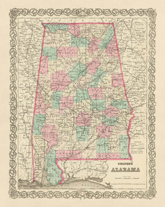 Tauchen Sie ein in die reiche Geschichte der Vereinigten Staaten mit dieser akribisch detaillierten Karte von Alabama, die 1855 vom angesehenen Kartographen JH Colton angefertigt wurde. Dieses bemerkenswerte Stück ist ein Beweis für die Kunstfertigkeit und Präzision, die Colton in sein Handwerk einbrachte, eine Darstellung seiner selbst Status als einer der besten amerikanischen Kartographen seiner Zeit.
