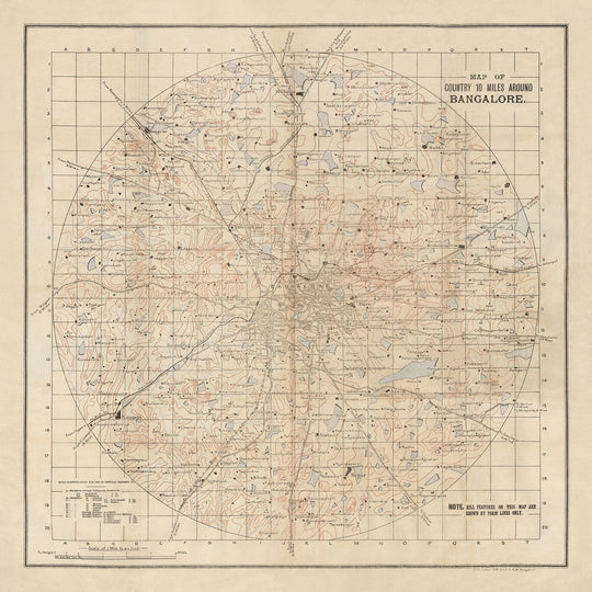 Die „Landkarte 10 Meilen um Bangalore“, die 1910 von einem anonymen Kartografen erstellt wurde, bietet einen faszinierenden Einblick in die historische Landschaft von Bangalore und den umliegenden Regionen. Dieser akribisch detaillierte Straßenplan der Stadt, gedruckt von der Litho. School 2nd QVOS & M in Bangalore, spiegelt die kartografische Präzision und das ästhetische Empfinden des frühen 20. Jahrhunderts wider. Beim Erkunden dieser Karte entdecken Sie das komplexe Straßennetz, die abwechslungsreiche, durch Höhenlinien gekennzeichnete Topografie und die zahlreichen Siedlungen, die ein lebendiges Bild der Vergangenheit Bangalores zeichnen.