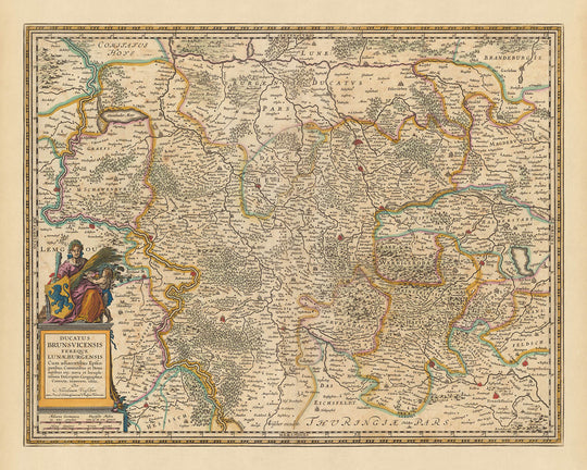 Der Schwerpunkt dieser Karte liegt auf den Regionen Braunschweig und Lüneburg, die für ihre historische Bedeutung und ihren kulturellen Reichtum bekannt sind. Brunswick, einst eine mächtige und einflussreiche unabhängige Stadt, wird in seiner vollen Pracht wunderschön dargestellt. Auch Lüneburg, eine Salzstadt, die ein wichtiger Teil der Hanse war, ist akribisch detailliert. Die Karte spiegelt den präzisen und detaillierten kartografischen Stil wider, der für das Goldene Zeitalter der Niederlande charakteristisch war.
