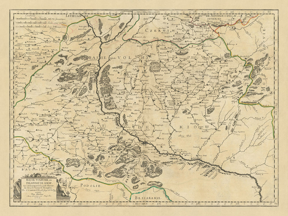 Im Wesentlichen ist „Basse Volhynie, ou Palatinat de Kiow“ nicht nur eine Karte, sondern ein historisches Dokument, das den Geist einer Epoche verkörpert. Es lädt den Betrachter ein, sich auf eine Reise durch die Zeit zu begeben und das reiche Erbe und die komplexe Geographie Osteuropas unter der Leitung von Nicolas Sanson zu erkunden, einem Meisterkartografen, dessen Arbeit immer wieder inspiriert und aufklärt. Diese Karte ist ein Muss für Kenner der Geschichte und der Kartografie gleichermaßen. Sie bietet eine einzigartige Mischung aus künstlerischer Schönheit und geografischer Präzision, die die Fantasie anregt und den Betrachter in das Herz Osteuropas des 17. Jahrhunderts entführt.