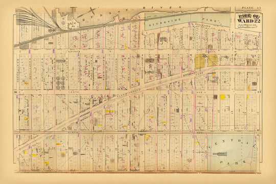 Diese handkolorierte lithografierte Karte aus dem Jahr 1879 bietet eine sorgfältige Darstellung eines Teils von Ward 22 in New York City. Die von GW Bromley erstellte Karte ist eine detaillierte Darstellung der damaligen Stadtlandschaft mit klar abgegrenzten Straßen, Alleen und bemerkenswerten öffentlichen Plätzen. Die Handwerkskunst von Bromley zeigt sich in den feinen Details und der Präzision dieses historischen Dokuments.