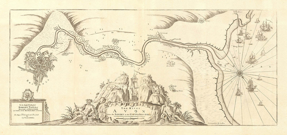 Betreten Sie die Welt der Navigation des 18. Jahrhunderts mit Captain Greenvile Collins' meisterhaftem Kartenwerk, "The River Avon from the Severn to the Citty of Bristoll." Diese exquisite Karte, die 1774 erstellt wurde, fängt die kurvenreiche Reise des River Avon ein, während er sich vom breiten Severn-Ästuar bis zum geschäftigen Herzen von Bristol schlängelt. Nach Süden ausgerichtet - ein charmantes Merkmal der Kartographie dieser Zeit - taucht die Karte den Betrachter in die Landschaft ein, wie sie den Händlern, Seeleuten und Entdeckern der Epoche bekannt war. Die Widmung an Robert Yate, Bürgermeister von Bristol und Meister der Merchant Hall, unterstreicht die tiefe Verbindung der Karte zum Handels Erbe der Stadt und ihrer entscheidenden Rolle im britischen maritimen Handel.