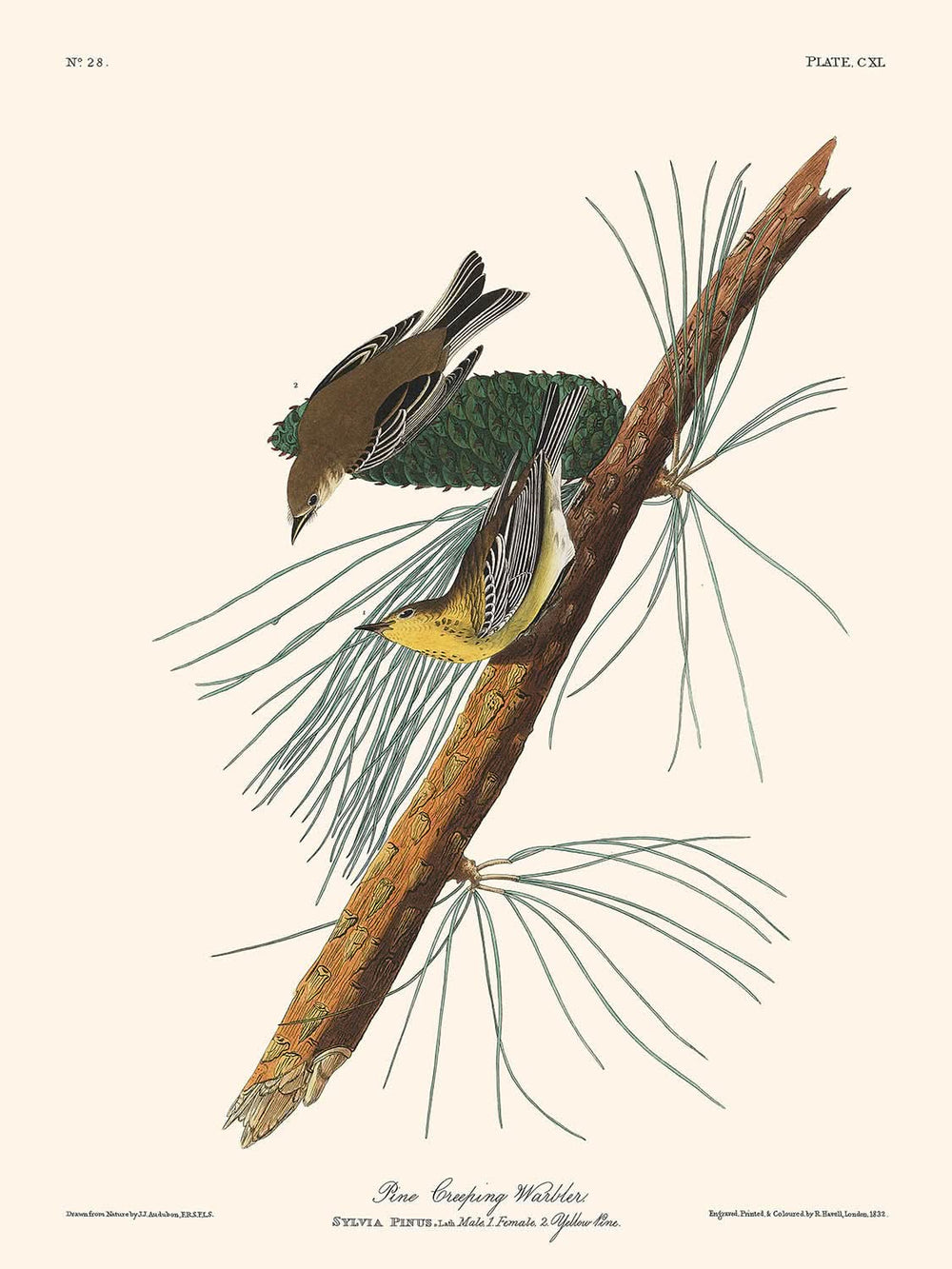 "Pine Creeping Warbler (Tafel 140)" von dem renommierten Ornithologen John James Audubon ist eine exquisite Illustration aus seiner gefeierten Serie, Birds of America, die erstmals 1827 veröffentlicht wurde. Diese angesehene Serie erfasste die Schönheit der Avifauna Nordamerikas in lebensgroßen, akribisch detaillierten Illustrationen, die auch fast zwei Jahrhunderte später noch für ihren künstlerischen und wissenschaftlichen Wert gefeiert werden.