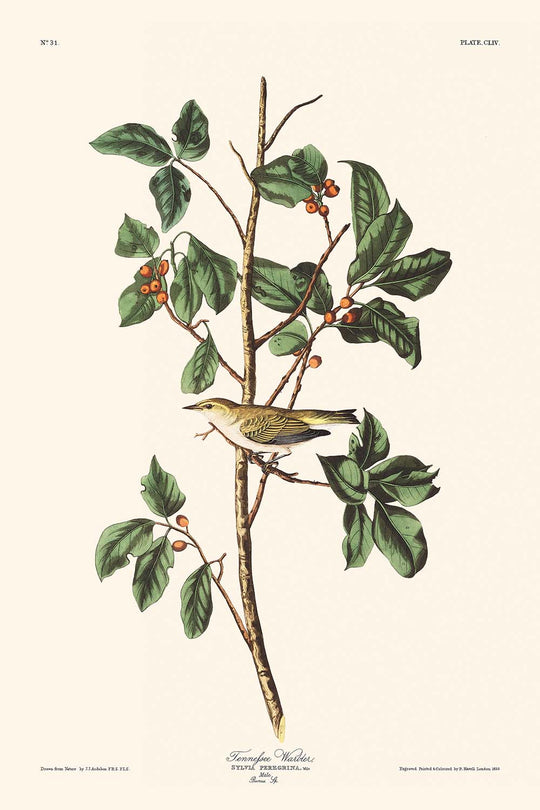 Der Druck des Tennessee-Waldsängers hebt lebendige Töne hervor – Olivgrün dominiert das Gefieder mit subtilen Schattierungen von Creme und Weiß, akzentuiert durch dunkelbraune Federn und blasse gelbe Markierungen über dem Auge, die das Wesen des Vogels mit lebendiger Genauigkeit einfangen. Die zarten Details in der Pose und der Umgebung des Vogels mit den Ilex laxiflora-Pflanzen verstärken den Dynamismus und die Bewegung, die typischerweise in statischen Drucken nicht zu sehen sind. Dieser Realismus lädt den Betrachter in Audubons Welt der Entdeckung und komplexen Schönheit ein.