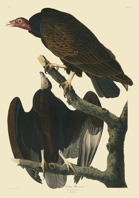Der Druck „Truthahnbussard“ fängt die rätselhafte Präsenz des Vogels durch Audubons meisterhafte Komposition und Farbgebung ein. Die lebendigen Bilder zeigen ein erwachsenes Männchen, das prominent thront, während ein Jungvogel darunter seine Flügel ausstreckt. Die strategische Platzierung eines vertikalen Baumstamms verbessert die visuelle Balance und präsentiert eine Szene, die sowohl strukturell solide als auch ästhetisch ansprechend ist. Diese Elemente zusammen zeigen Audubons beispiellose Fähigkeit, wissenschaftliche Beobachtung mit künstlerischer Schönheit zu verbinden.