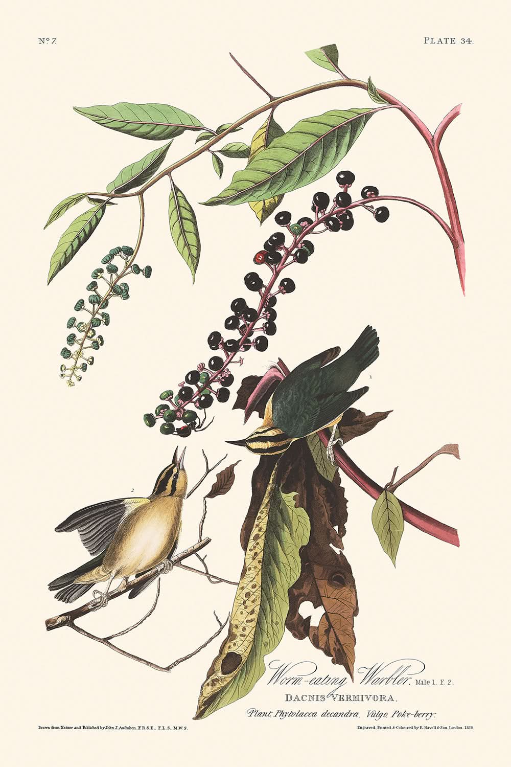 „Wurmfressender Waldsänger“ (Tafel 34), 1827 von John James Audubon geschaffen, ist eine fesselnde Illustration aus seiner berühmten Serie „Birds of America“. Dieses Kunstwerk zeigt nicht nur Audubons herausragende Fähigkeit, die komplexe Schönheit des Vogellebens einzufangen, sondern spiegelt auch seine seit Generationen geschätzten scharfsinnigen Beobachtungen der Natur wider.