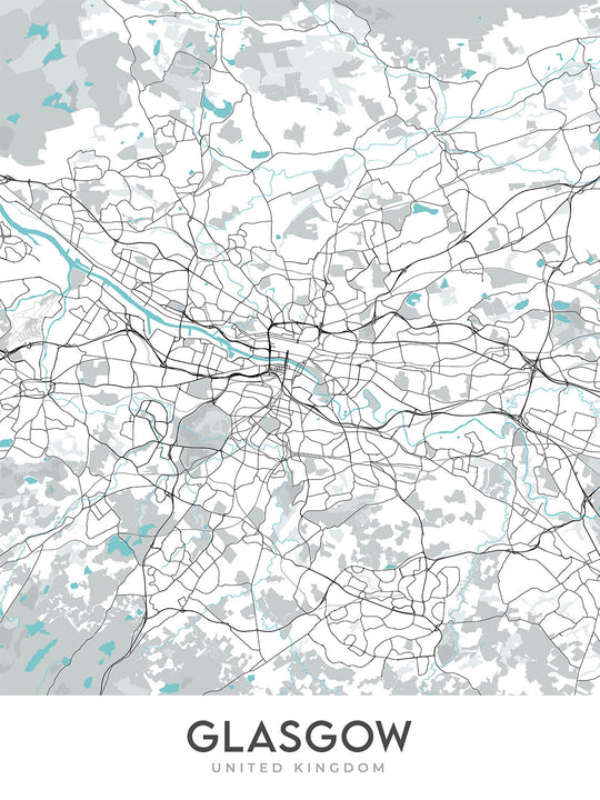 Dieser Stadtplan von Glasgow ist ein moderner Stadtplan mit einer detaillierten Straßenkarte ohne Beschriftung, der sich perfekt für die Inneneinrichtung und Wohnungseinrichtung eignet. Die Karte deckt einen großen Bereich der Stadt ab, einschließlich vieler bemerkenswerter Viertel, Sehenswürdigkeiten und Durchgangsstraßen.