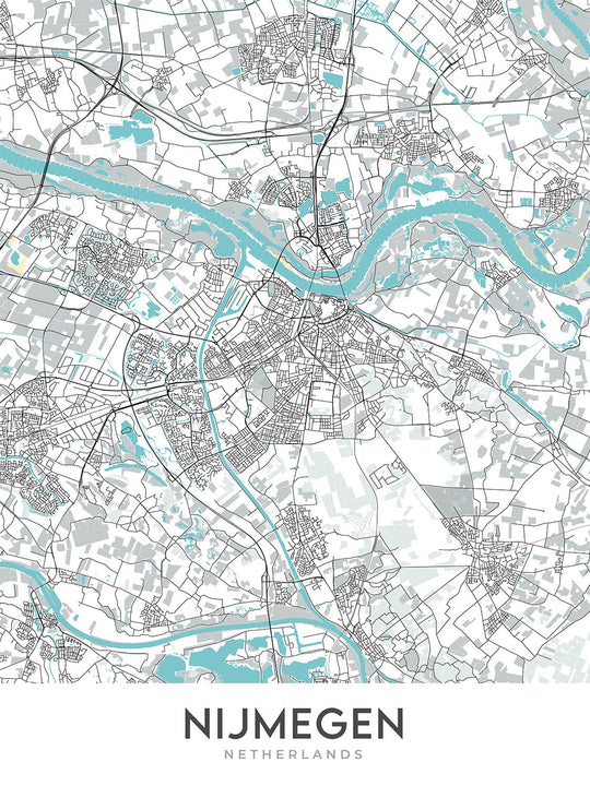 Insgesamt ist diese Karte von Nijmegen ein schönes und informatives Kunstwerk, das perfekt für alle ist, die Karten lieben oder sich für die Stadt Nijmegen interessieren. Es ist eine großartige Möglichkeit, jedem Zuhause oder Büro einen Hauch von Eleganz und Stil zu verleihen.