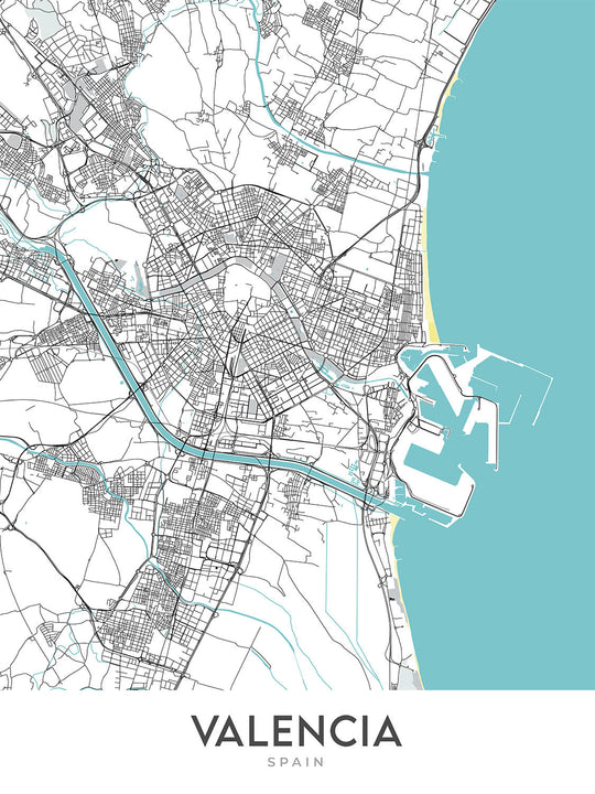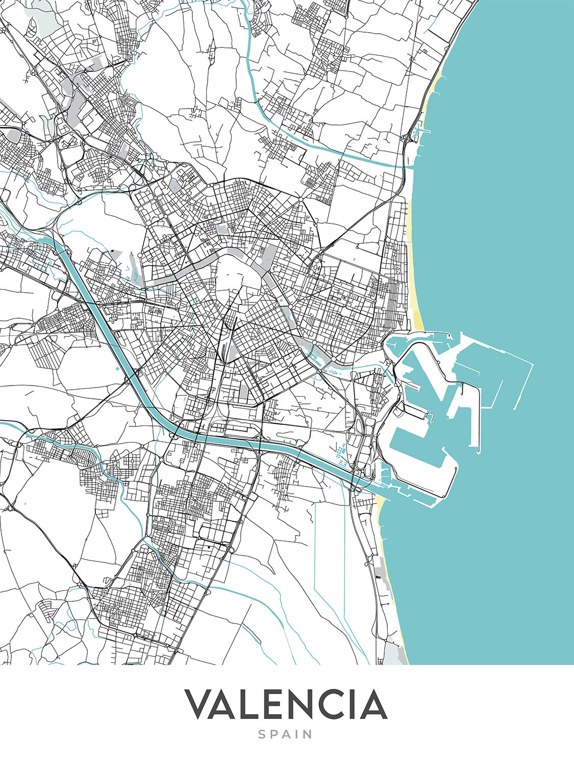 Moderne Stadtkarte von Valencia, Spanien: Ciutat Vella, El Carmen, Ruzafa, Stadt der Künste und Wissenschaften, Turia-Gärten