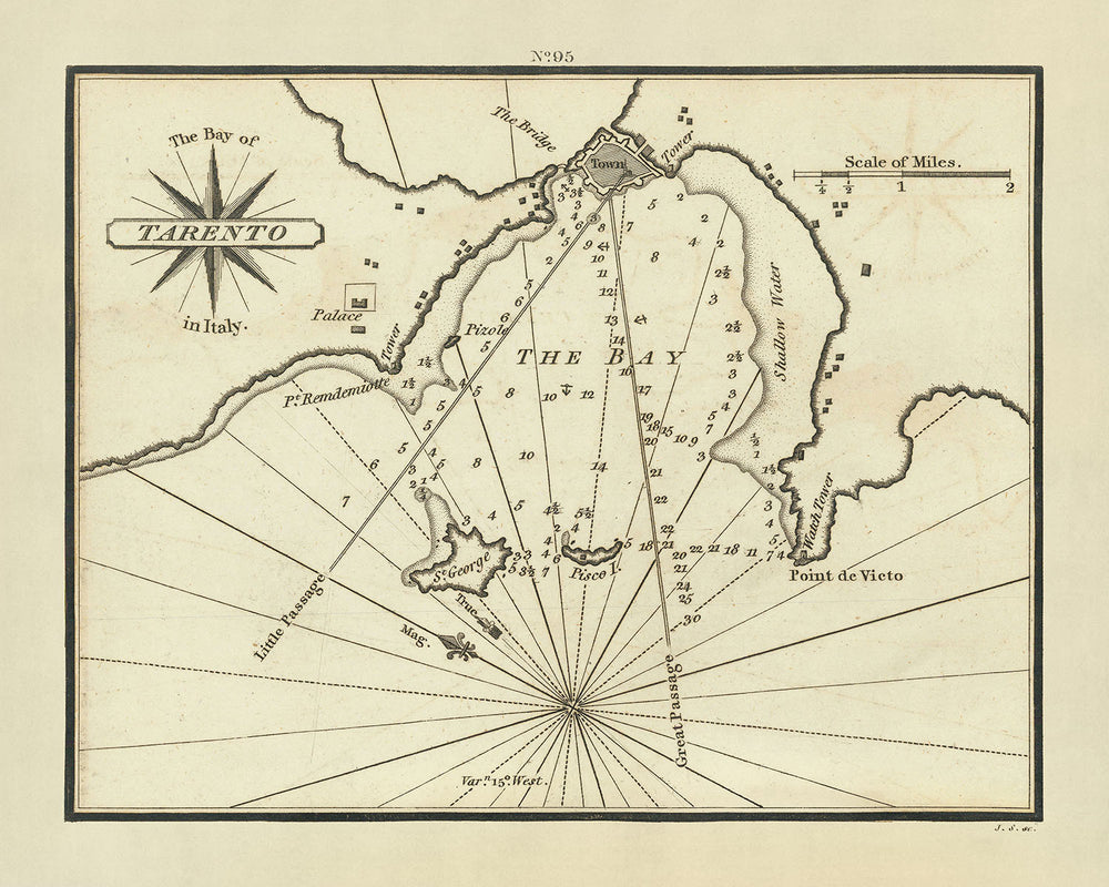 Die Karte beschreibt nicht nur die hydrographischen Aspekte der Bucht von Taranto, sondern bereichert auch unser Verständnis der geografischen Anordnung der Gegend zu Beginn des 19. Jahrhunderts. Sie hebt wichtige Orte wie die Städte Taranto, Pizzolo und Remdemone sowie die strategischen Gewässer wie die Flüsse St. George und Little Passage hervor. Die Einbeziehung der Inseln Pisco und St Pietro sowie bedeutender maritimer Routen bietet Einblicke in die sozioökonomischen Bedingungen der Zeit, insbesondere in Bezug auf Handel und Verteidigung.
