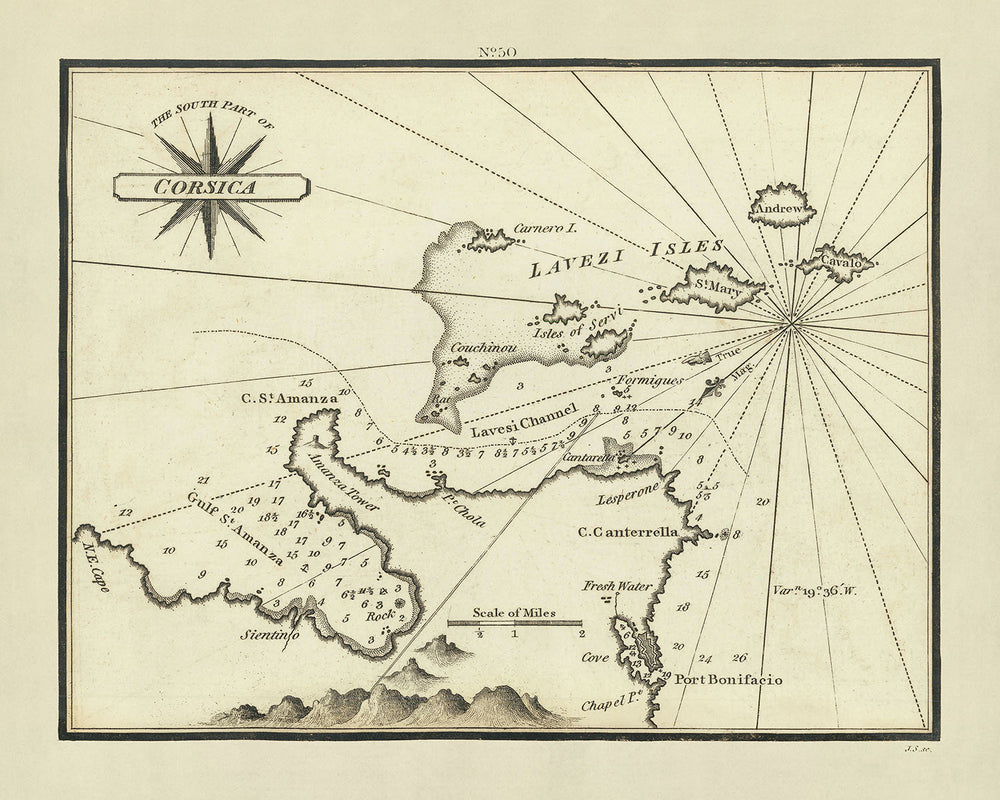 Die Karte von William Heather ist einzigartig ausgerichtet, mit Südosten an der Spitze, eine Wahl, die die strategischen Navigationsrouten der Zeit hervorhebt. Die Einbeziehung von Tiefenmessungen – Wassertiefenmessungen – ist besonders wertvoll und spiegelt den Nutzen der Karte für Seeleute wider, die durch die gefährlichen Gewässer des Mittelmeers navigierten. Darüber hinaus zeigt die Karte detailliert die topografischen Merkmale wie die imposanten Berge und ausgedehnten Wälder Korsikas und bietet einen umfassenden Überblick, der über die reine Navigation hinausgeht und die natürliche Schönheit der Insel einfängt.