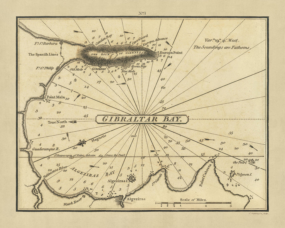 Die Karte zeigt detailliert die Buchten von Gibraltar und Algeciras, die sich vom berühmten Felsen von Gibraltar bis zur Spitze Cabreta und der Stadt Algeciras erstrecken. Sie ist nach traditionellen kartografischen Praktiken mit Norden ausgerichtet und enthält eine Fülle von Informationen, die für die Navigation von entscheidender Bedeutung sind. Bemerkenswert sind die Tiefenangaben, Ankerplätze und Navigationsgefahren wie Schiffswracks, die deutlich markiert sind und den primären Zweck der Karte für die Seenavigation widerspiegeln. Die Einbeziehung verschiedener Festungen und Militäranlagen unterstreicht die militärische Bedeutung des Gebiets in einer Zeit, in der die Kontrolle der Meere für den Aufbau von Imperien von entscheidender Bedeutung war.