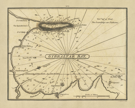 Neben praktischen maritimen Details bietet die Karte auch einen Einblick in die Landschaft und zeigt einige topografische Merkmale wie das zerklüftete Gelände des Felsens von Gibraltar. Diese Mischung aus Land- und Seeinformationen bietet einen ganzheitlichen Überblick über die Geografie der Region und ist damit eine unschätzbare Ressource zum Verständnis historischer Marinestrategien und der natürlichen Herausforderungen, denen sich die Seefahrer der damaligen Zeit stellen mussten.