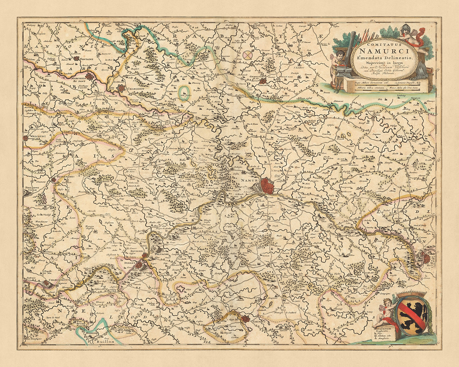 Die Grafschaft Namur, heute Teil des heutigen Belgiens, ist mit ihren verschiedenen Regionen und politischen Spaltungen wunderschön dargestellt. Die Karte umfasst namhafte Städte wie Charleroi, Dinant, Sambreville, Huy und Gembloux. Jede Stadt ist präzise markiert und bietet einen faszinierenden Einblick in die Stadtplanung und Architekturstile des späten 17. Jahrhunderts.