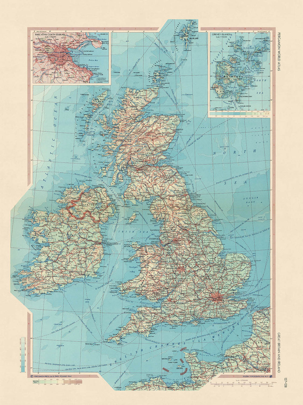 Diese Karte von Großbritannien und Irland aus dem Jahr 1967 des polnischen Armee-Topographiedienstes ist eine detaillierte politische und physische Karte, die einen umfassenden Überblick über die britischen Inseln bietet. Die Karte konzentriert sich auf die Britischen Inseln, wobei die umliegenden Länder Frankreich, Belgien, die Niederlande, Dänemark, Norwegen, Schweden und Island in Nebenkarten dargestellt sind. Die Karte enthält außerdem detaillierte Ausschnitte von Dublin (Baile Atha Cliath) und den Orkney-Inseln.