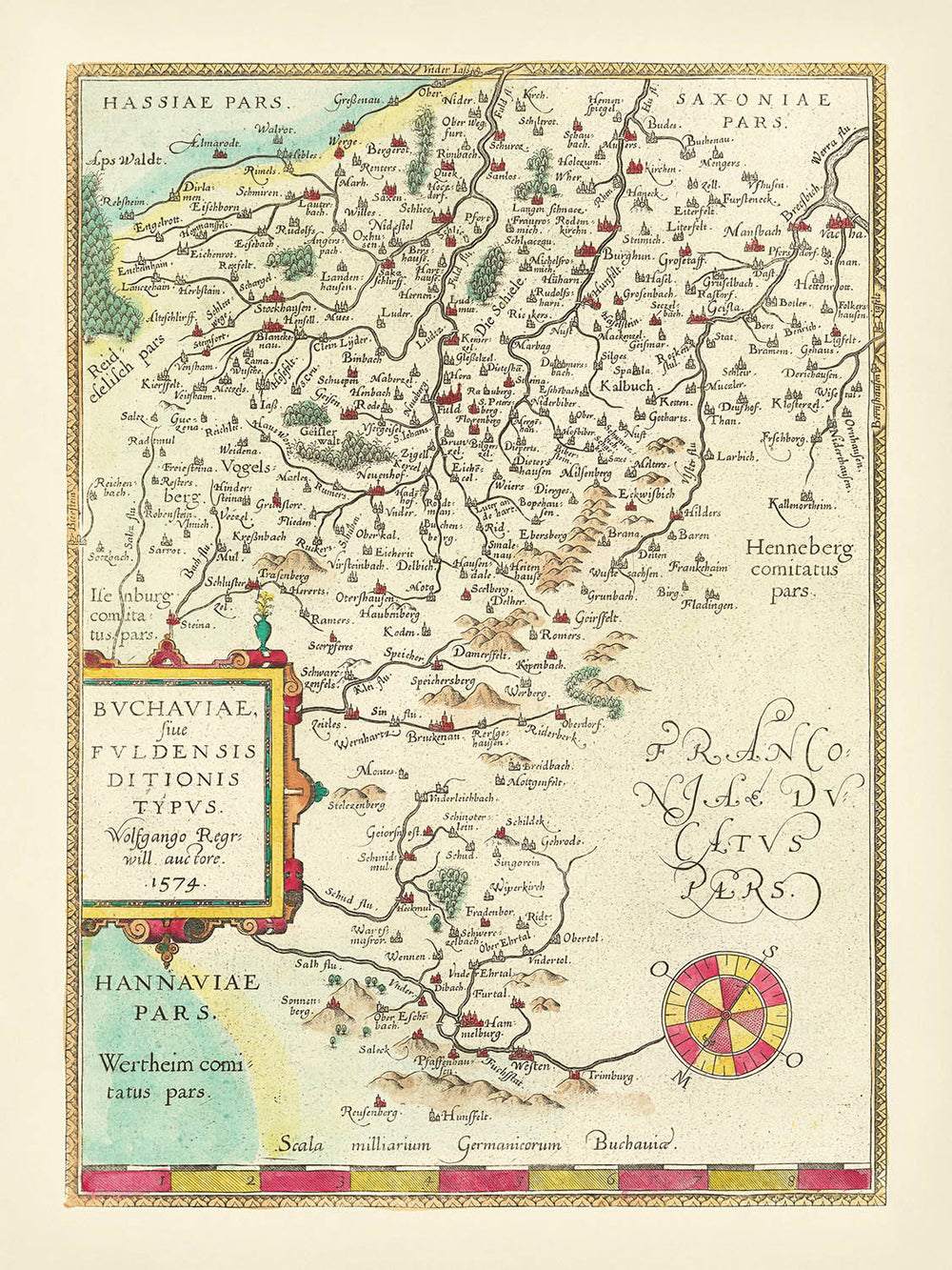 Die Karte hebt die reiche Topografie der Fuld-Region hervor, einschließlich ihrer Wälder, Berge und Flüsse. Die stilisierte Darstellung von Waldgebieten und Gebirgen sowie die auffällige Darstellung von Flüssen bietet ein lebendiges Bild der natürlichen Landschaft. Die Grenzen der verschiedenen Regionen, die mit gestrichelten Linien markiert sind, geben Einblicke in die politischen Grenzen der damaligen Zeit. Diese detaillierte Darstellung sowohl der physischen als auch der politischen Geografie macht die Karte zu einer unschätzbaren Ressource für das Verständnis des historischen Kontexts der Region.