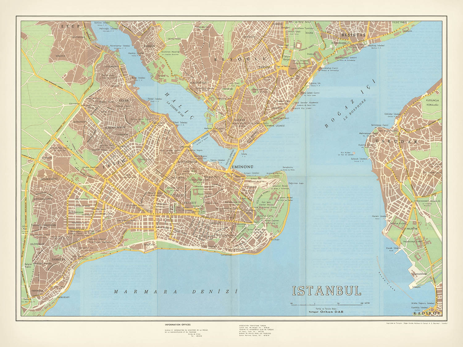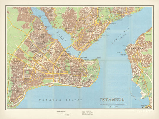 Entdecken Sie den faszinierenden Reiz von Istanbul durch die "Stadtstraßenkarte von Istanbul", ein bemerkenswertes kartografisches Meisterwerk aus den 1960er Jahren. Erstellt vom angesehenen Ministerium für Presse, Publikation und Tourismus, fängt diese Karte eine transformative Ära in Istanbuls reicher Geschichte ein. Sie zeigt die lebendige städtische Landschaft der Stadt während einer Zeit rascher Entwicklung, beeinflusst durch das Tourismusförderungsgesetz von 1953. Dieses Gesetz spielte eine entscheidende Rolle bei der Gestaltung der modernen Identität der Stadt, indem es Investoren von der Besteuerung befreite und eine aufstrebende Tourismusindustrie förderte.
