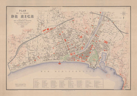 Als diese Karte veröffentlicht wurde, befand sich die Stadt nach Jahrhunderten, in denen sie zwischen Invasoren gehandelt wurde, die durch ihre strategische Lage am Mittelmeer angezogen wurden, endlich unter französischer Kontrolle. Ende des 19. Jahrhunderts wurde Nizza ein Ziel wohlhabender englischer Besucher, weshalb es an der Küste dieser Karte ein Gebiet namens "Promenade des Anglais" gibt.