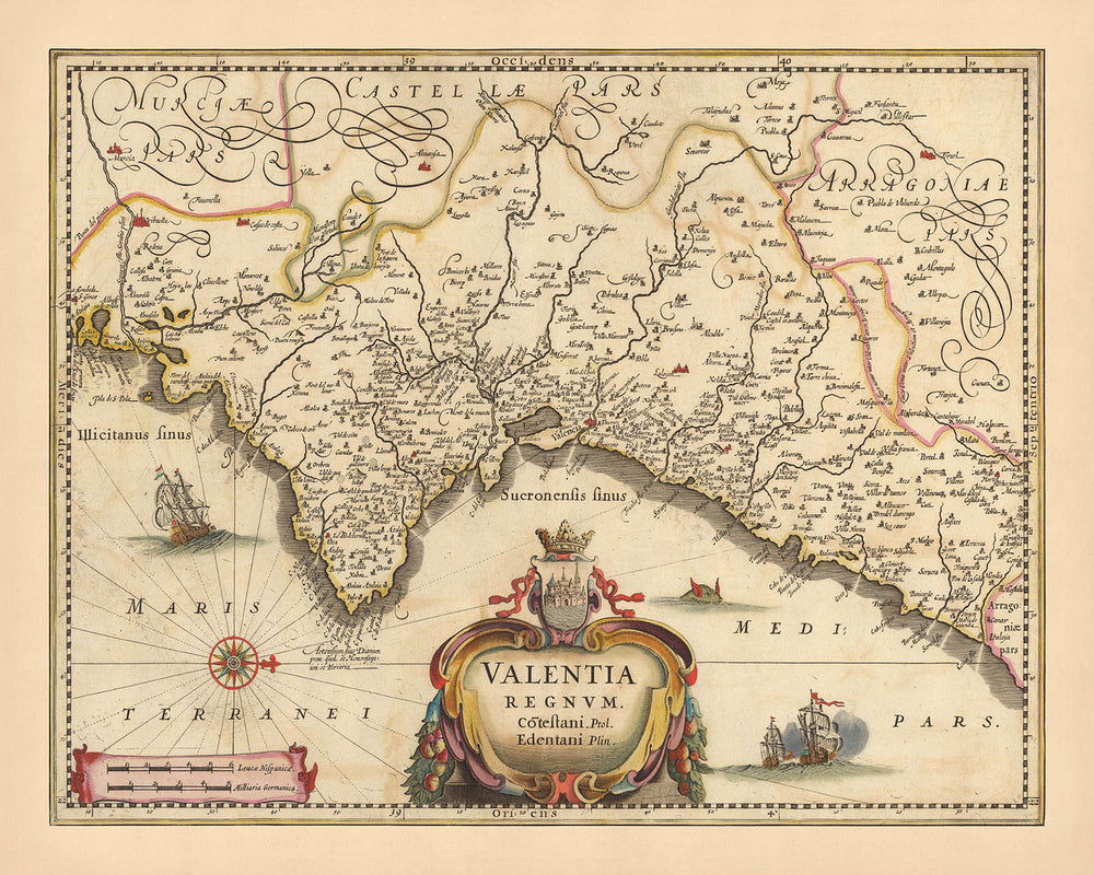 Der handkolorierte Umriss der Karte konzentriert sich auf Valencia, eine Stadt, die für ihre reiche Geschichte und architektonische Pracht bekannt ist. Die Karte zeigt Verwaltungsgrenzen, Städte, Wälder, Wasserstraßen, Kanäle, Berge und Sehenswürdigkeiten und bietet so einen umfassenden Überblick über die Region. Die dekorativen Kartuschen, die Windrose und die Loxodromen tragen zur Ästhetik der Karte bei, während das bildlich dargestellte Relief ein Gefühl von Tiefe und Realismus vermittelt.