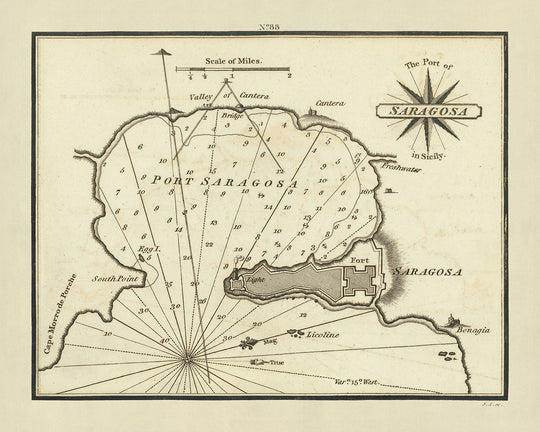 Diese Karte von "Der Hafen von Saragosa in Sizilien" von William Heather ist mehr als nur eine Navigationshilfe; sie ist ein Portal zur Vergangenheit, das uns einlädt, die reiche maritime Geschichte und das kartografische Erbe des Mittelmeers zu erkunden.