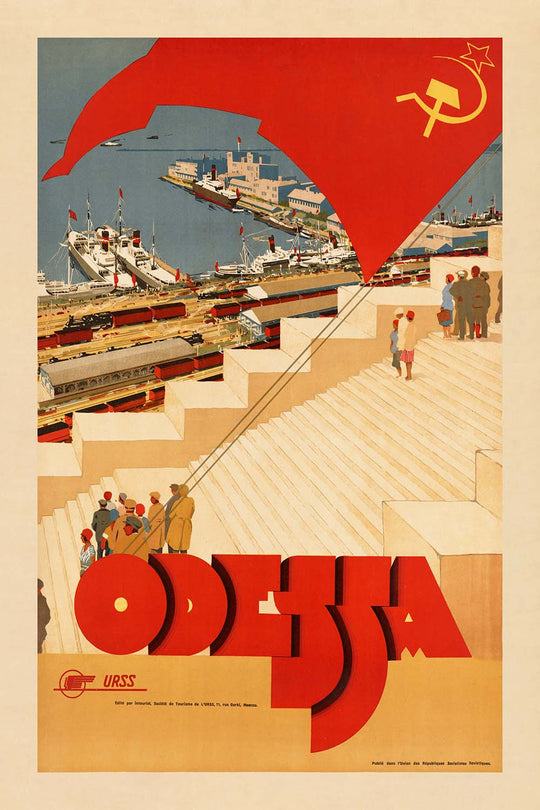Odessa is a striking vintage travel poster by an anonymous Soviet-era designer, created to promote the Black Sea port city during the early to mid-20th century. Rendered in the bold, streamlined language of Soviet propaganda art, it captures Odessa’s maritime allure while projecting the optimism and pride of the period. The sweeping red flag, the hammer and sickle, and the assertive ODESSA typography come together to evoke a dynamic coastal destination within the Soviet Union’s cultural orbit—today recognized as Odessa, Ukraine.