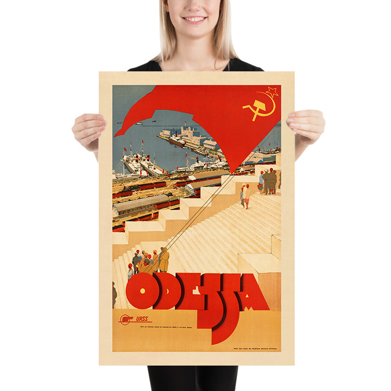 Design and color: The palette centers on warm beige, maritime blues, and emphatic reds—the last symbolically tied to the Communist Party and here expressed in a sweeping flag that drives the composition. Flat, unmodulated color fields and clean, structured forms ensure instant impact. The monumental ODESSA logotype anchors the scene, while the coastal setting is distilled to essential shapes, giving the work a timeless, architectural quality. The result is both a piece of graphic history and a fresh, modern accent—ideal for rooms with mid-century, industrial, or contemporary decor where a statement of color and form is welcome.