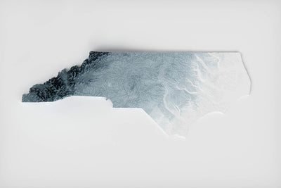Bringen Sie North Carolina zum Leben mit einer Karte, die so dynamisch ist wie die Landschaft selbst. Der Staat erstreckt sich von den rauen Gipfeln und tiefen Tälern der Appalachen im Westen – wo steile Bergrücken und hohe Gipfel das Licht einfangen und dramatische Schatten werfen – bis zu dem breiten, sanften Piedmont im Herzen des Staates. Hier sehen Sie sanfte Wellen, die durch ein Spiel von Licht hervorgehoben werden, das die subtilen Hügel und Flusstäler zeigt, die sich durch die Region schlängeln.