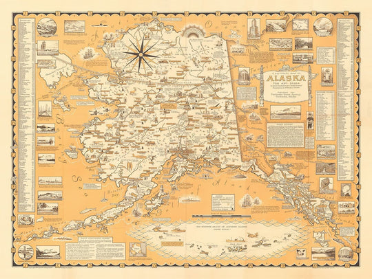 Die linke und rechte Seite der Karte enthält Gitterreferenzen, um Ihnen zu helfen, die Städte, Dörfer und Wahrzeichen von Alaska zu lokalisieren. Die Karte ist auch mit Illustrationen von Tieren (wie dem Eisbären und dem Moschusochsen), Gebäuden und berühmten Wahrzeichen gefüllt. Städte wie Anchorage, Fairbanks, Juneau und Tanana sind ebenfalls auf dieser Karte sichtbar.
