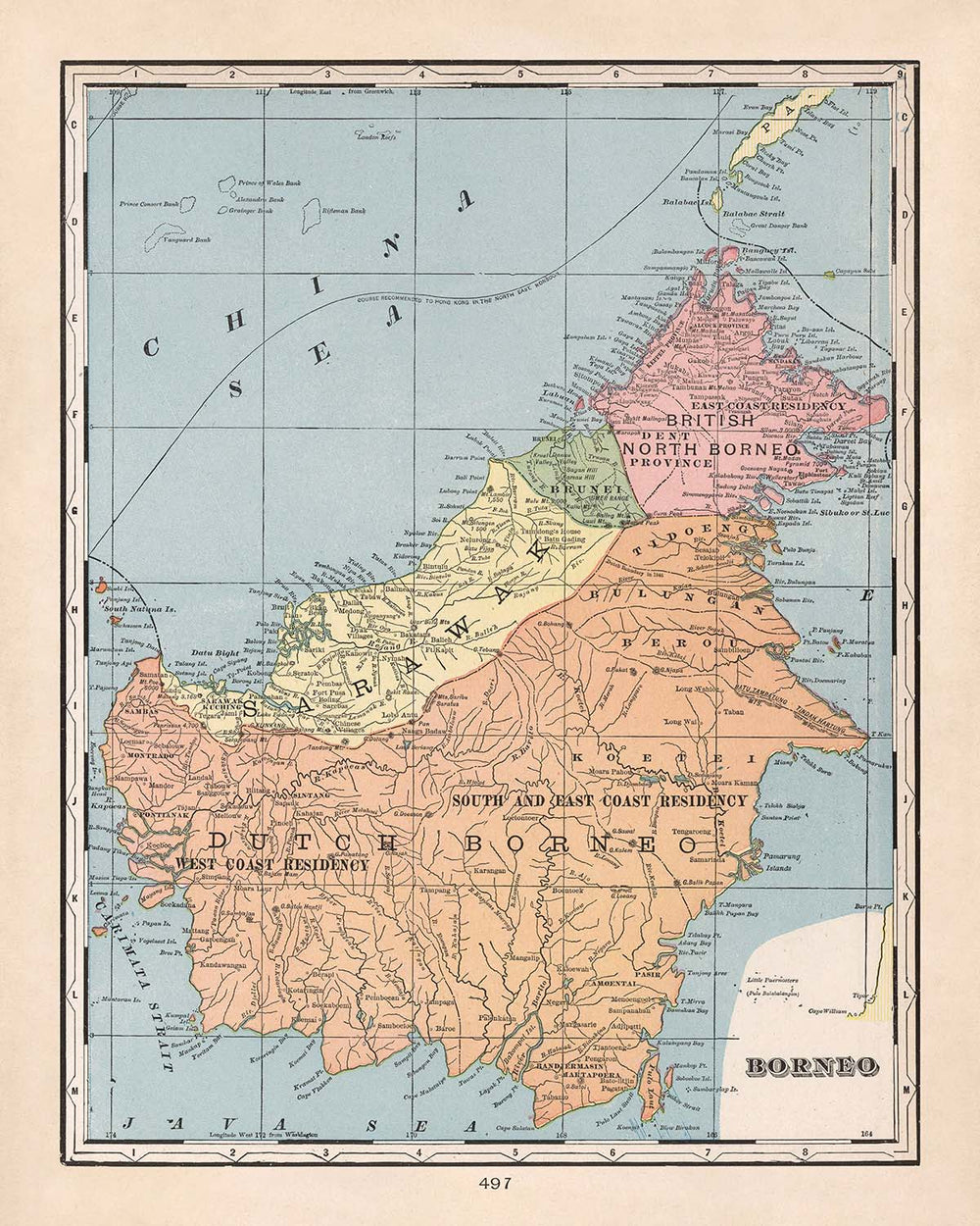 Über seine politischen Grenzen hinaus ist die Karte reich an natürlicher und menschlicher Geographie. Gebirgszüge und hügelige Innenteile werden mit subtilen Hachuren dargestellt, die auf die rauen Landschaften hinweisen, die Borneos Geschichte und Kultur seit langem geprägt haben. Wichtige Flüsse und Meerenge sind klar markiert und bieten lebenswichtige Arterien für Handel und Kommunikation. Die Städte und Dörfer der Karte – Kuching, Banjarmasin, Pontianak, Sandakan und viele andere – sind sorgfältig eingezeichnet, ihre Positionen spiegeln sowohl die kolonialen Verwaltungszentren als auch die beständigen Siedlungen der indigenen Völker wider. Jeder Name beschwört Geschichten von Handel, Migration und kulturellem Austausch herauf.