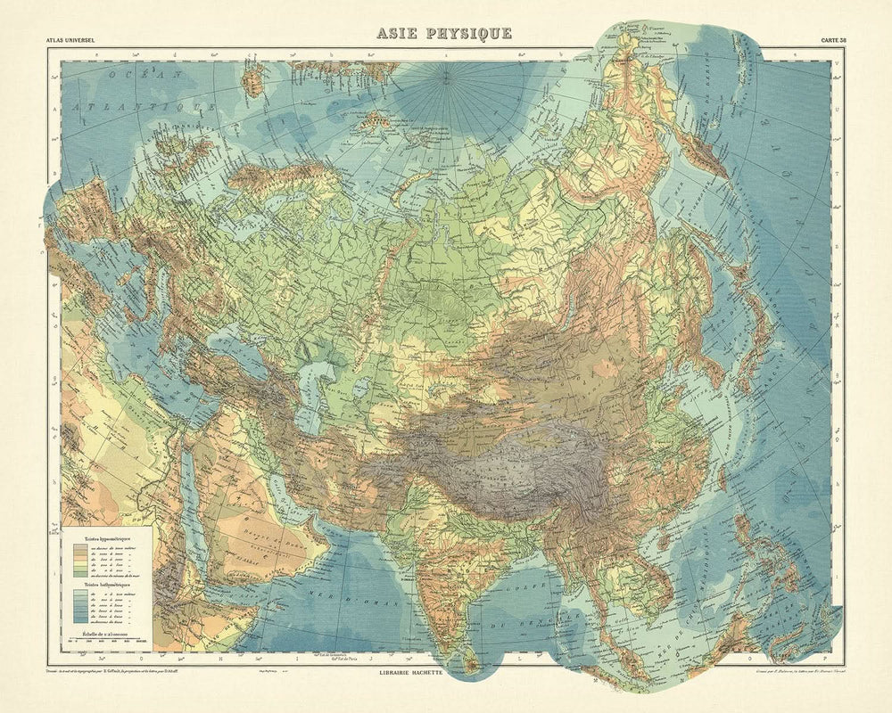 „Asie Physique“ ist mehr als eine Karte; es ist eine thematische Erkundung der physischen Geographie Asiens. Gebirgszüge wie der Himalaya und der Ural sowie große Gewässer wie das Kaspische Meer und der Baikalsee werden akribisch detailliert dargestellt. Diese Merkmale sind nicht nur geografische Markierungen; sie sind wesentlich für das Verständnis der natürlichen Barrieren und Kanäle, die die menschliche Geschichte und die Siedlungsmuster auf dem gesamten Kontinent geprägt haben. Die Karte dient als wertvolles Lehrmittel und bietet Einblicke in die natürliche Welt, wie sie vor fast einem Jahrhundert wahrgenommen wurde.