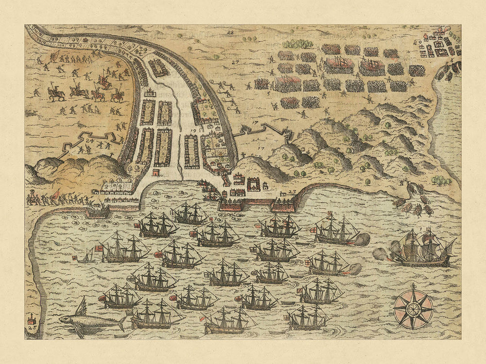 Der künstlerische Stil der Karte ist charakteristisch für die Kartographie der späten Renaissance, die sich durch ihre aufwendigen Gravuren und die Aufmerksamkeit für geografische Details auszeichnet. Die Einbeziehung einer Kompassrose und die sorgfältige Darstellung der Küstenlandschaften spiegeln das navigational Wissen der damaligen Zeit wider. Diese Karte ist nicht nur eine Darstellung eines Ortes, sondern ein Fenster in die Vergangenheit, das das Wesen von Entdeckung und Eroberung einfängt, das das Zeitalter der Entdeckungen prägte.