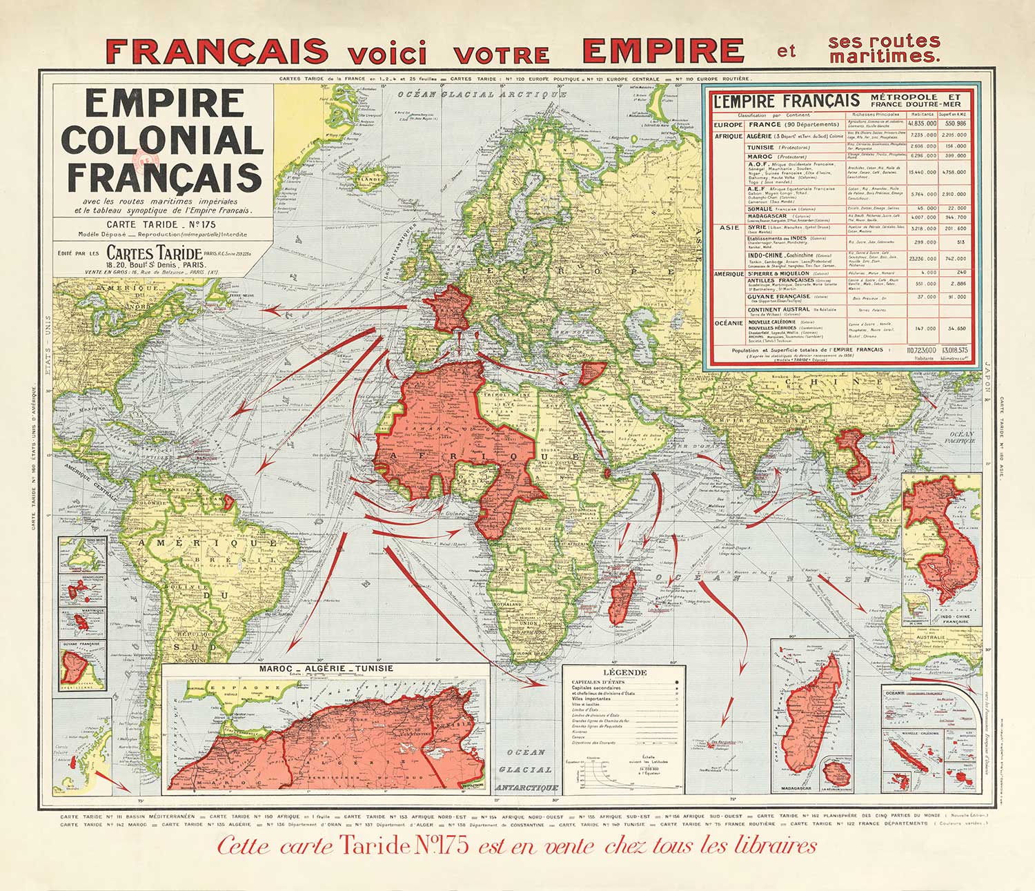 Alte Karte des französischen Kolonialreichs, 1938 von Taride: Frankreich, Napoleon, Nordafrika, Seewege