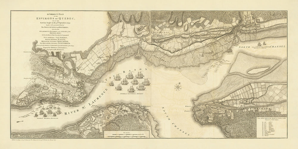 Das Design der Karte ist sowohl funktional als auch ästhetisch ansprechend, mit detaillierten topografischen Elementen und einer klaren Darstellung des Sankt-Lorenz-Stroms, der Nord- und Südkanaele sowie der Isle of Orleans. Die sorgfältige Illustration der französischen Linien und Batterien sowie der britischen Lager und Angriffe bietet eine lebendige Darstellung der Intensität der Belagerung. Die Karte enthält auch eine Liste der britischen Armeelager, die während der Belagerung von Quebec im Einsatz waren, was ihren historischen Wert und ihre Nützlichkeit als Forschungsinstrument weiter erhöht.